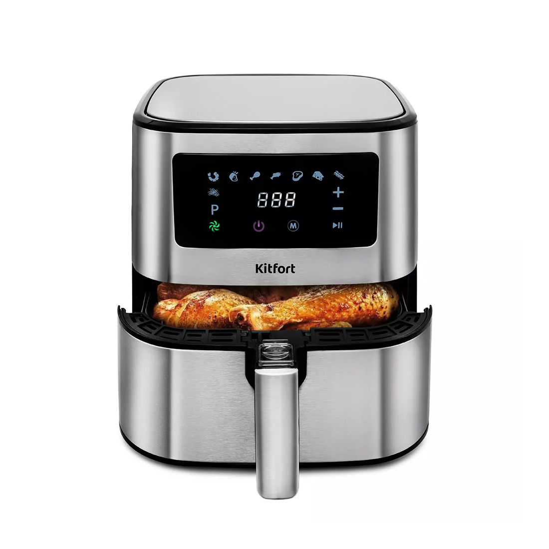 Аэрогриль, Kitfort, КТ-2228, Сенсорное управление, 5.5л, 9 программ, Температура нагрева 80-200°C, Таймер 60 мин, Съемная крышка, Длина шнура 0.9м, Мощность 1700 Вт, Стальной/чёрный