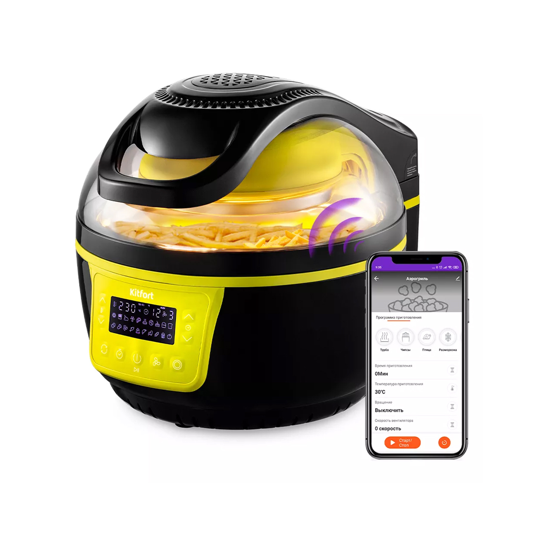 Аэрогриль, Kitfort, КТ-2243, 1 чаша, Объем 7.5 л, 20 программ, Температура нагрева 30-250°C, Управление с телефона/кнопочное, Таймер, Мощность 1200-1400 Вт, Длина шнура 1м, Черный/Желтый