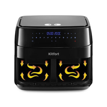 Аэрогриль, Kitfort, КТ-2250, 2 раздельных чаши, 12 программ, Объем чаш 9л (2 х 4,5 л), Температура 50-200°С, Таймер 60 мин, Уровень шума до 50 дБ, Сенсорное управление, Длина шнура 1 м, Мощность 1750 Вт, Черный