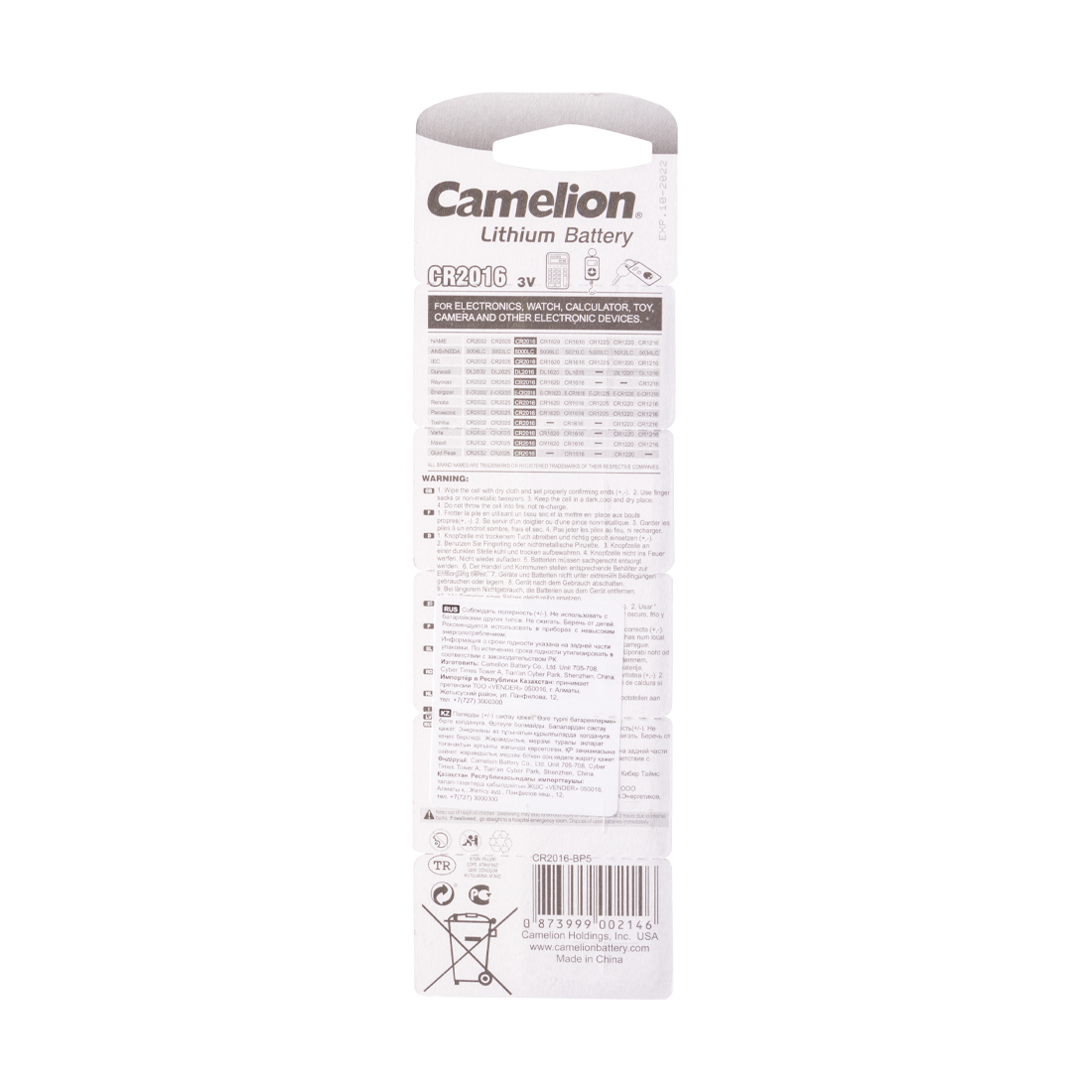 Батарейка, CAMELION, CR2016-BP5, Lithium Battery, CR2016, 3V, 75 mAh, 5 шт. Блистер
