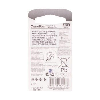 Батарейка, CAMELION, A312-BP6(0%Hg) , Zinc Air, A312, 1.45V, 0% Ртути, 6 шт., Блистер