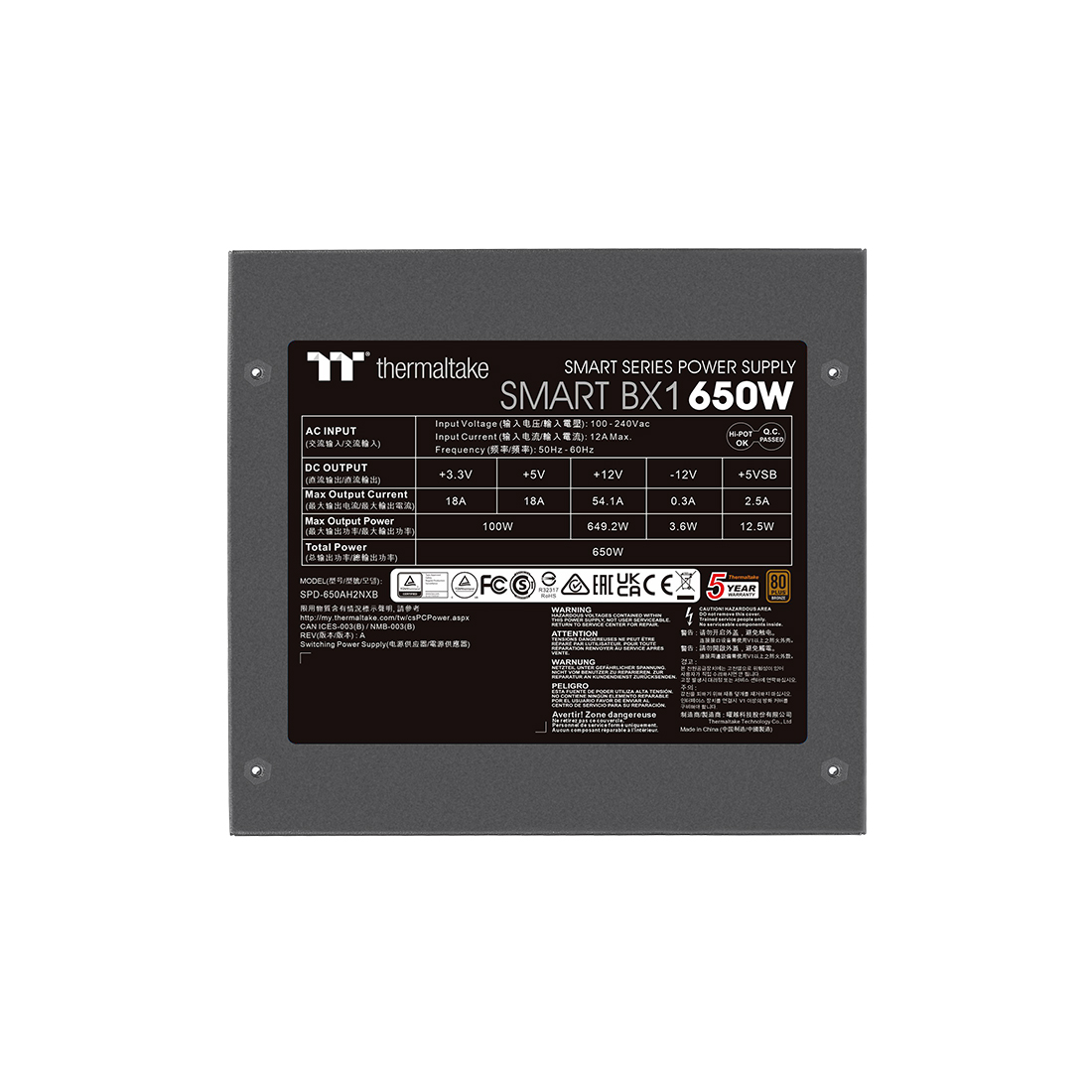 Блок питания, Thermaltake, Smart BX1 D2D 650W, PS-SPD-0650NNFABE-4, 650W, ATX, Bronze, APFC, 20+4 pin, 4+4pin, 6*Sata, 4*Molex, 2*PCI-E 6+2 pin, FDD, Non-modular, Вентилятор 12 см, 150*86*140мм, Чёрный