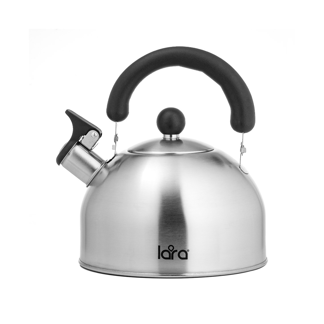 Чайник, LARA, LR00-40, матовый, Объем 2.5л, Нержавеющая сталь, Индукционное дно, Толщина стенок 0.35мм, Свисток, Складная ручка, Стальной/Черный