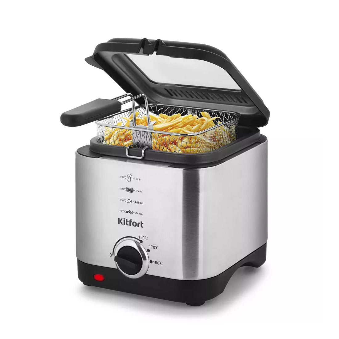 Фритюрница, Kitfort, КТ-2017, Ёмкость чаши 1.5 л, 3 температурных режима, Температура 130-190°C, Длина шнура 0.99 м, Мощность 900 Вт, Стальной
