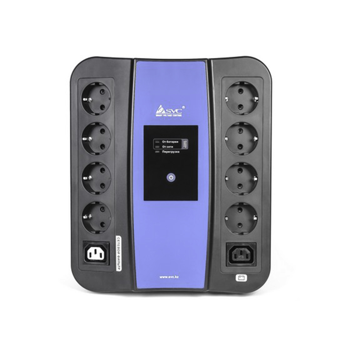 Источник бесперебойного питания, SVC, U-600, USB, Мощность 600ВА/360Вт, Диапазон работы AVR: 165-275В, AVR в режиме Booster: 138-292В, Бат.: 12В/7,5 Ач., 8 вых.: Shuko CEE7(4 с работой от батареи,4 сетевой фильтр), 2 вых.: IEC C13, Защита тел. линии, USB 5В/2А*2 шт., Чёрно-синий