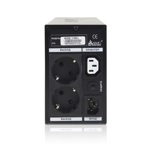 Источник бесперебойного питания, SVC, V-500-L, Мощность 500ВА/300Вт, Диапазон работы AVR: 165-275В, AVR в режиме Booster: 138-292В, Бат.: 12В/4.5 Ач*1шт., 3 вых.: 2 Shuko CEE7+1 IEC C13 (Bypass), Чёрный