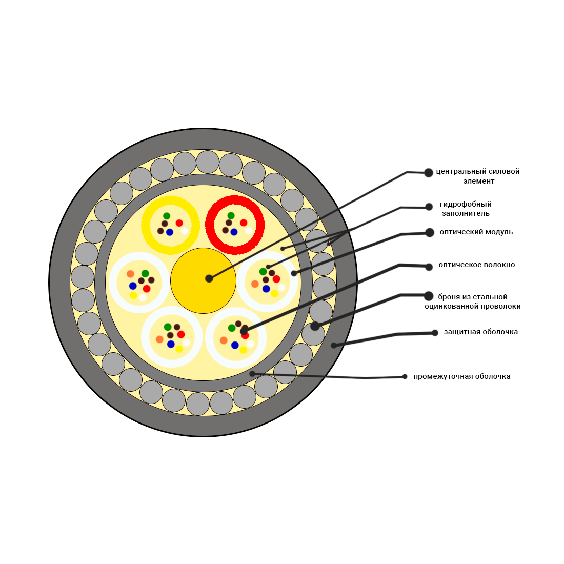 Кабель оптоволоконный, СКО, ОКБ-0,22-48П-8кН, предназначен для прокладки в грунт на основе модульной конструкции.