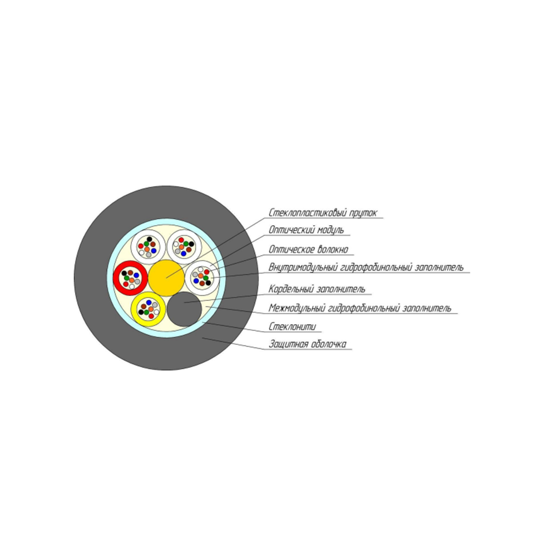 Кабель оптоволоконный, СКО, ОКГ-0.22-24П-3.1 кН , предназначен для прокладки в защитных пластмассовых трубах на основе модульной конструкции.