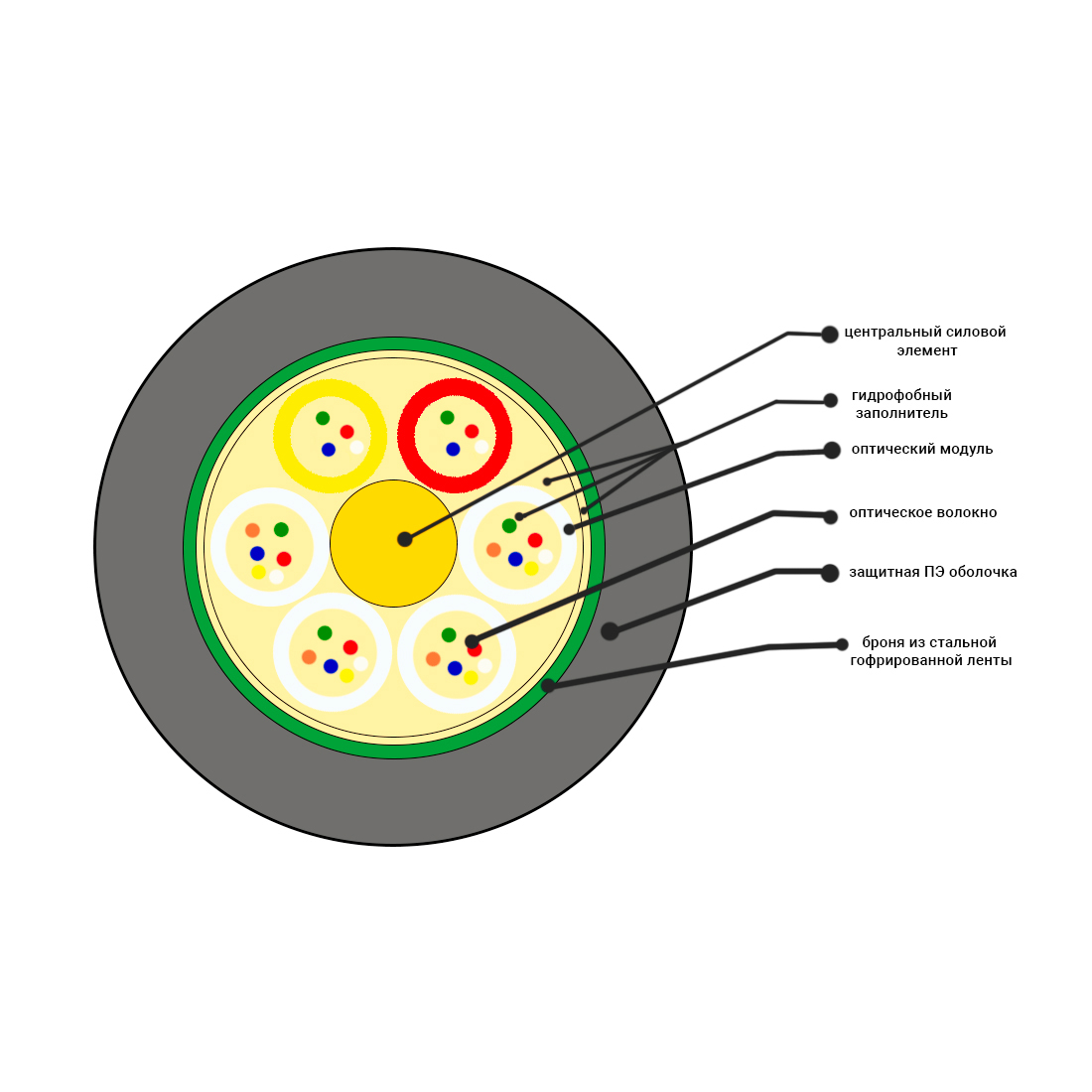 Кабель оптоволоконный, СКО, ОКЛм-0,22-12П-2.7 кН, броня из стальной гофрированной ленты для прокладки в кабельную канализацию в модульной констркуции.