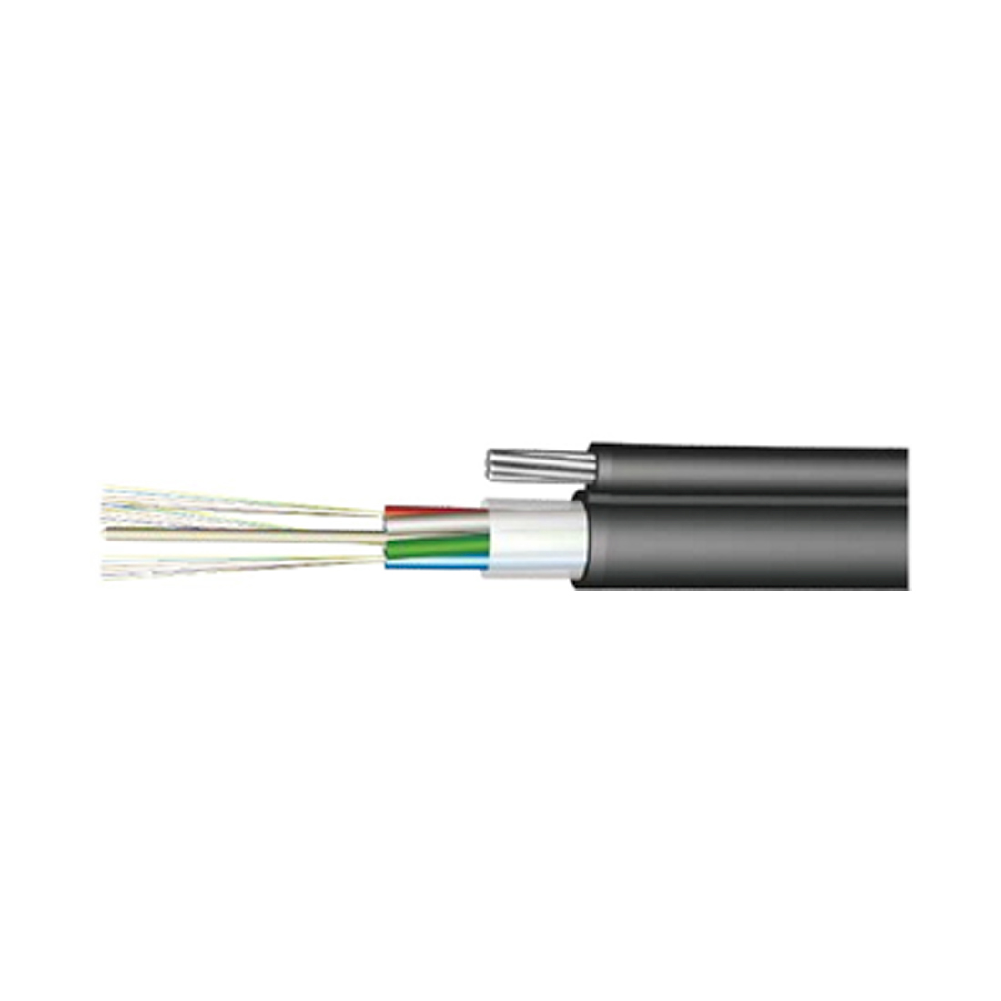 Кабель состоит из сердечника-модуля из ПТБ. Внутри оптического модуля свободно уложены оптические волокна. Свободное пространство внутри оптического модуля заполнено гидрофобным заполнителем. Несущий элемент расположен продольно к сердечнику. Одновременно поверх сердечника и несущего элемента накладываются оболочки. Оболочки сердечника и несущего элемента соединены вдоль общей образующей и выполнены из полиэтилена высокой плотности. При количестве волокон более 12 для идентификации используется кольцевая покраска и/или группирование в пучки с помощью идентификационных нитей.