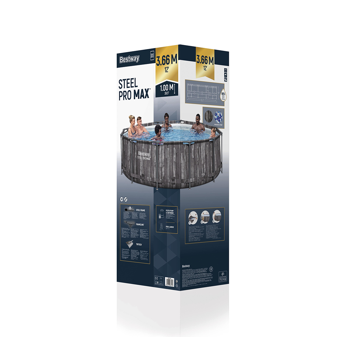 Каркасный бассейн Steel Pro MAX 366 х 100 см, BESTWAY, 5614X, Винил, 9150 л., Стальной каркас, Ф-насос 58383 (2006л/ч), Лестница 58335, Деревянный принт, Цветная коробка
