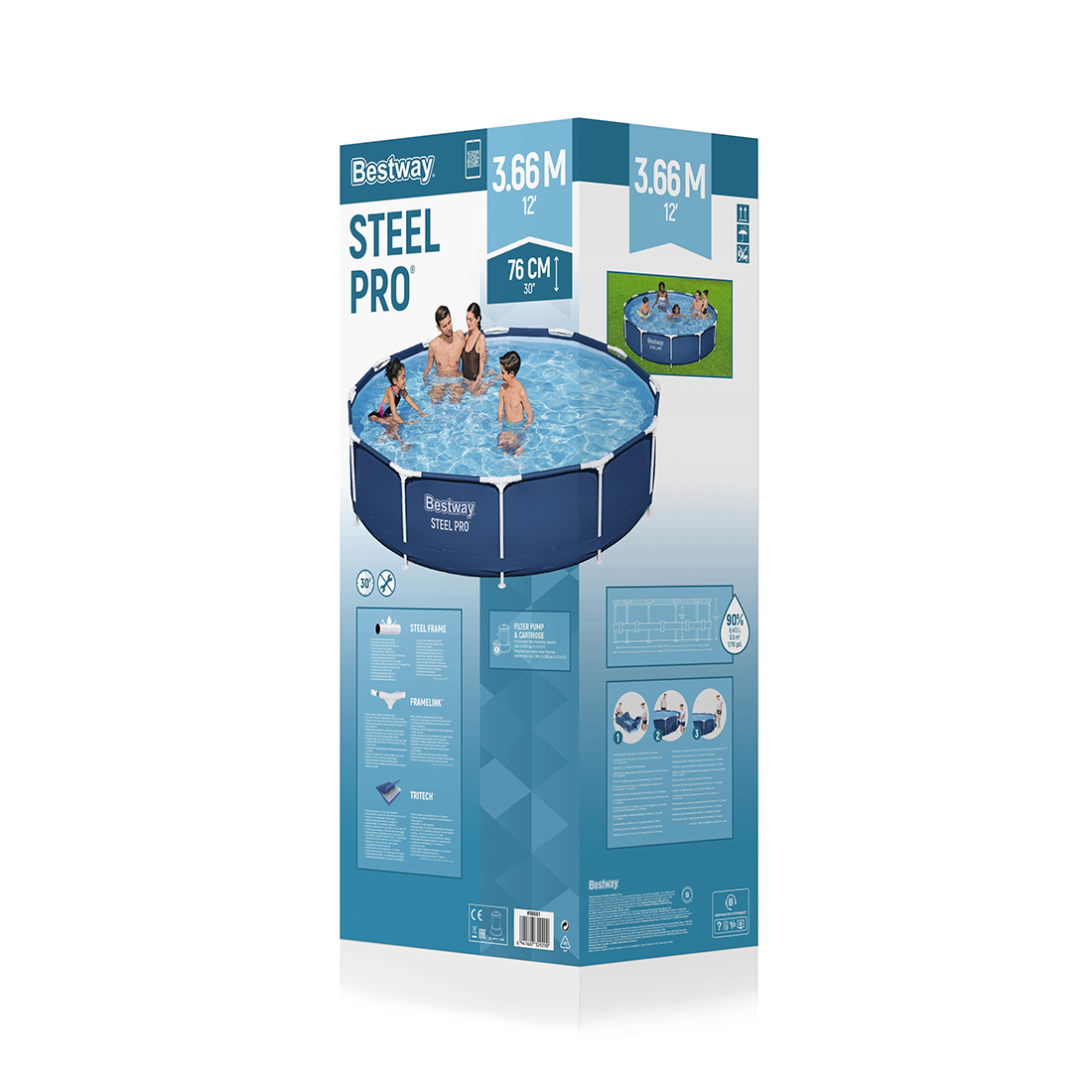 Каркасный бассейн Steel Pro 366 х 76 см, BESTWAY, 56681, Винил, 6473 л., Стальной каркас, Ф-насос 58381 (1249л/ч), Синий, Цветная коробка