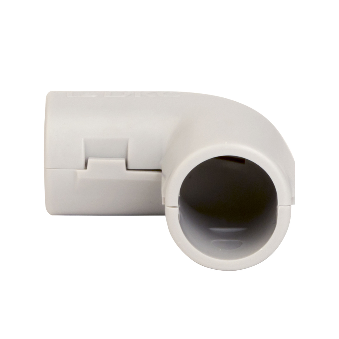 Конено открывающееся – элемент кабеленесущей системы, который предназначен для соединения труб одинакового диаметра под прямым углом. Применение аксессуаров позволяет строить сложные трассы. Разъемная конструкция позволяет устанавливать аксессуар на уже смонтированные участки. Степень пыле- и влагозащиты поворота — IP 40. Температура эксплуатации аксессуара: от –25 °С до +60 °С.