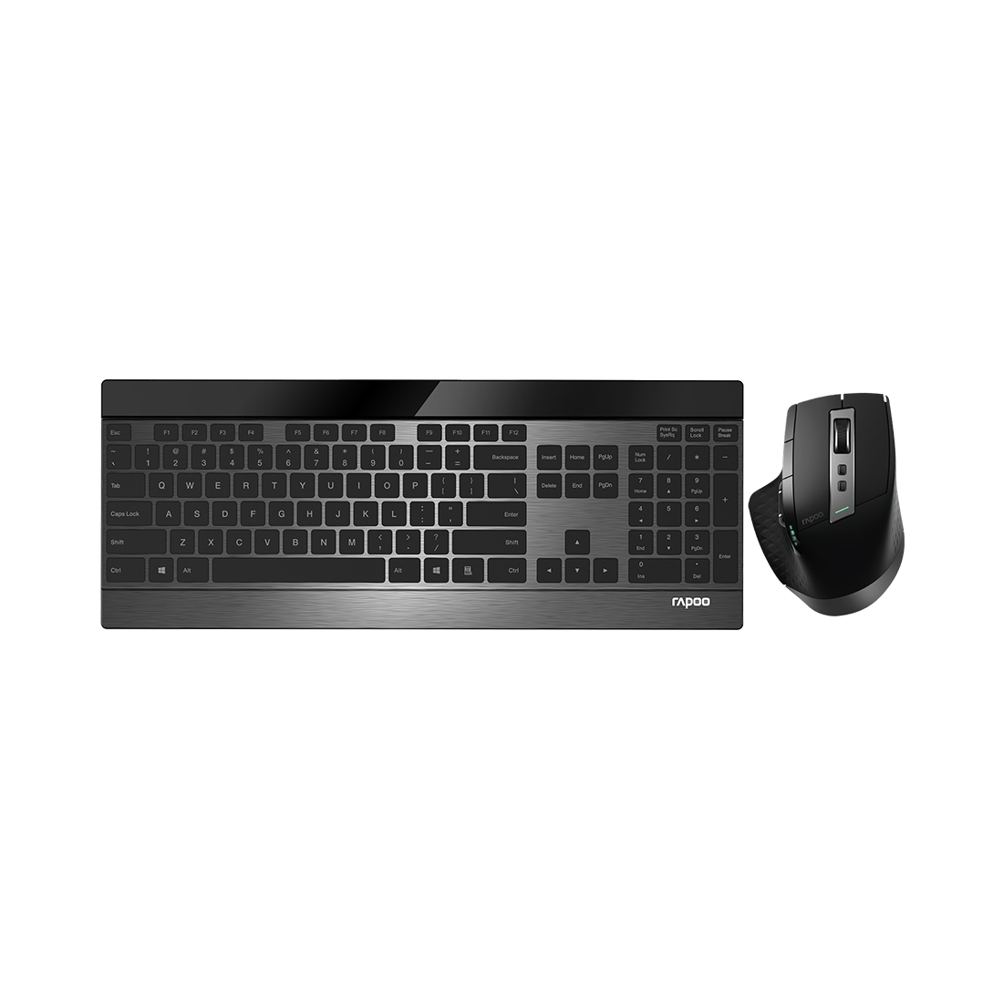 Комплект Клавиатура + Мышь, Rapoo, 9900M, Беспроводная 2.4G, Bluetooth 3.0, 4.0, 3200DPI, Нано-ресивер, Кол-во стандартных клавиш 104, Рус/Англ, Алюминий, Чёрный,