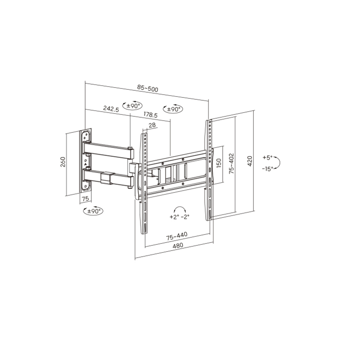 Кронштейн для ТВ и мониторов, Brateck, LPA80-443, Макс. нагрузка — 50 кг, Диагональ экрана от 32″ до 75″, Угол поворота до 180°, Угол наклона -15° +5°, Уровень, Чёрный