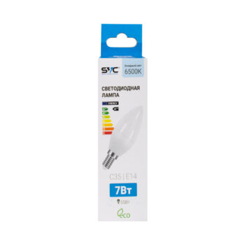 Лампа светодиодная, SVC, LED C35-7W-E14-6500K, Свеча, Мощность 7Вт, Тип колбы C35, Цвет. температура 6500K, Цоколь E27, Холодный