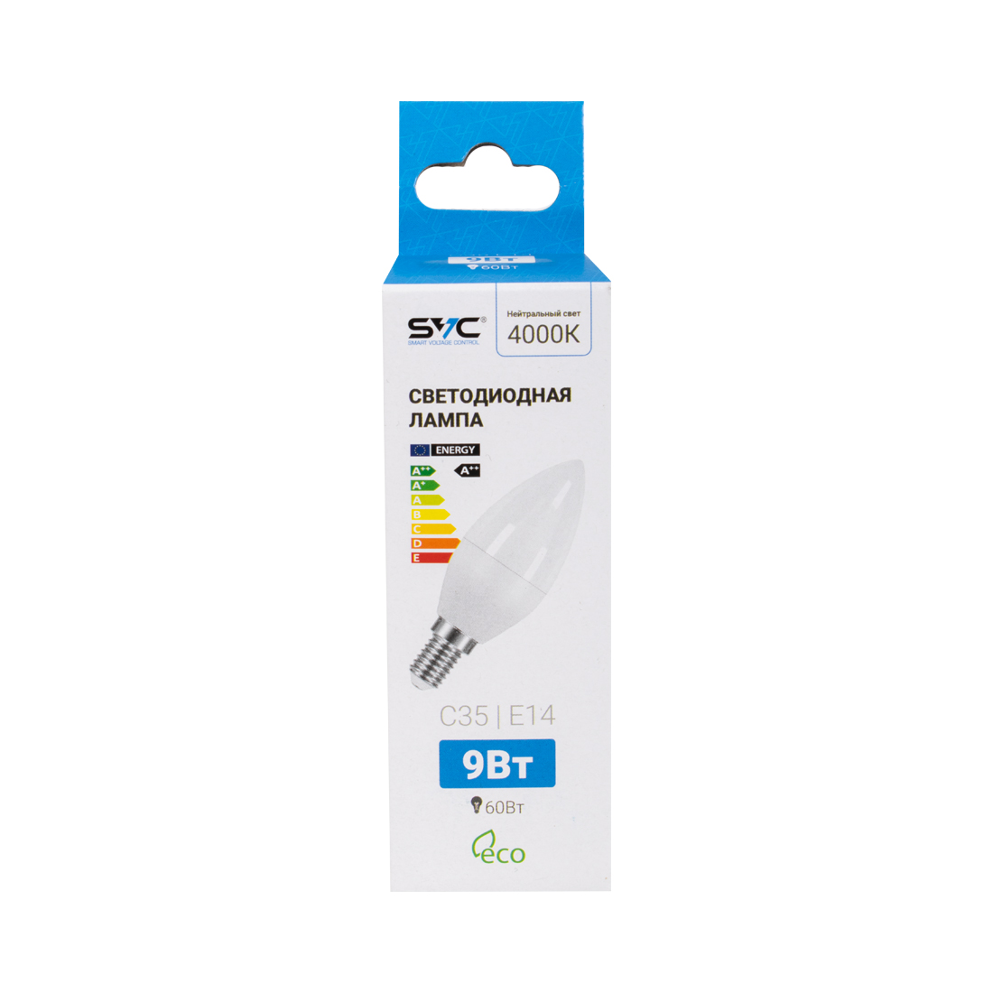Лампа светодиодная, SVC, LED C35-9W-E14-4000K, Свеча, Мощность 9Вт, Тип колбы C35, Цвет. температура 4000K, Цоколь E14, Нейтральный