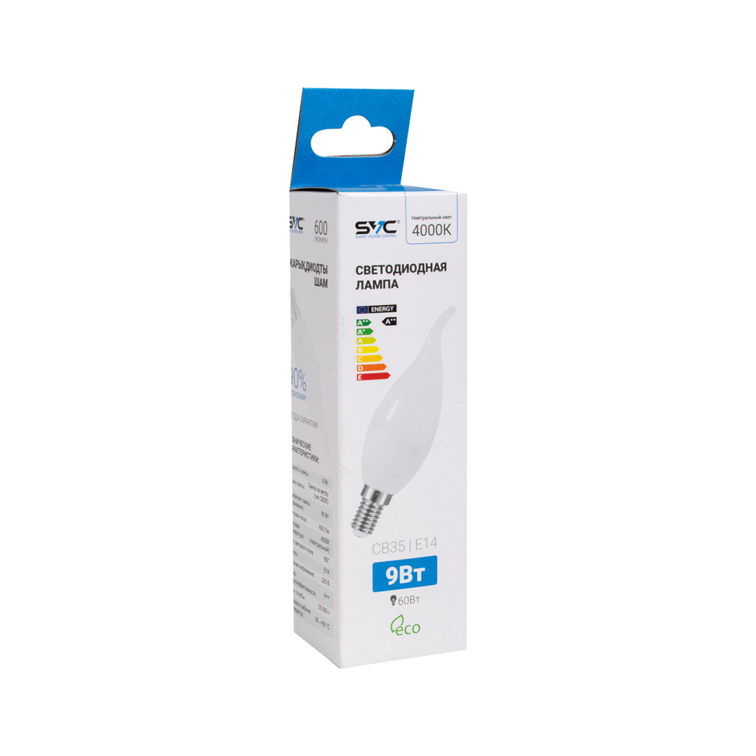 Лампа светодиодная, SVC, LED CB35-9W-E14-4000K, Свеча на ветру, Мощность 9Вт, Тип колбы CВ35, Цвет. температура 4000K, Цоколь E14, Нейтральный