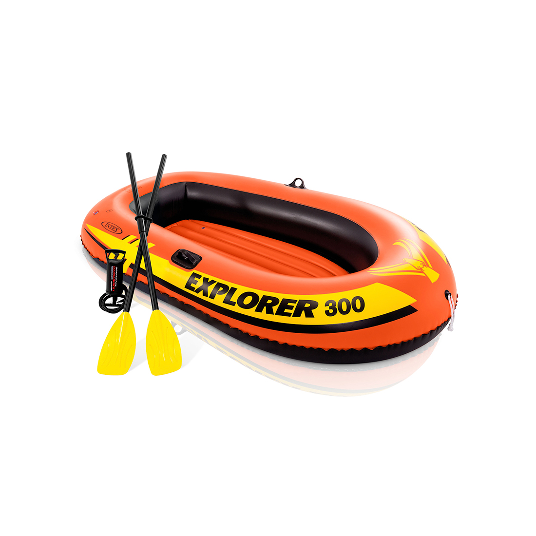 Лодка надувная Exlorer 300 set 211 х 117 см, INTEX, 58332NP, Винил, 6+, Двухкамерная, Грузоподъемность до 186 кг., В наборе весла 59623 и насос 68612, Оранжевая, Цветная коробка