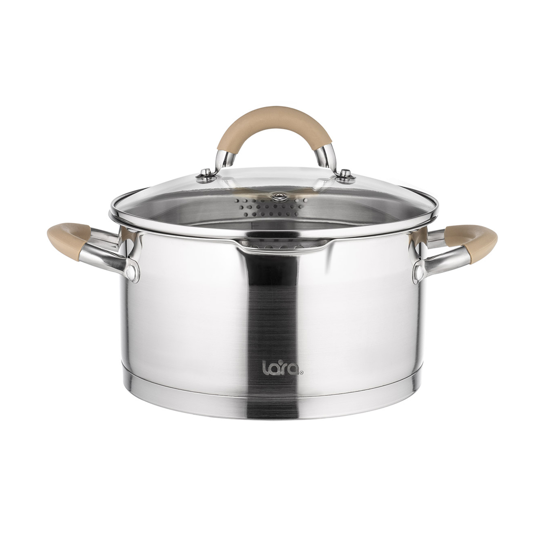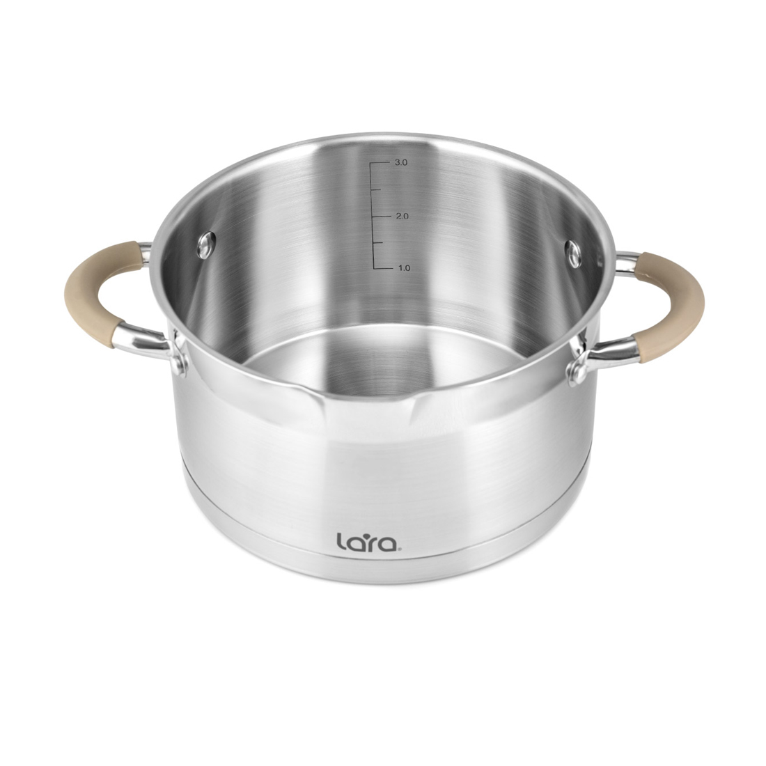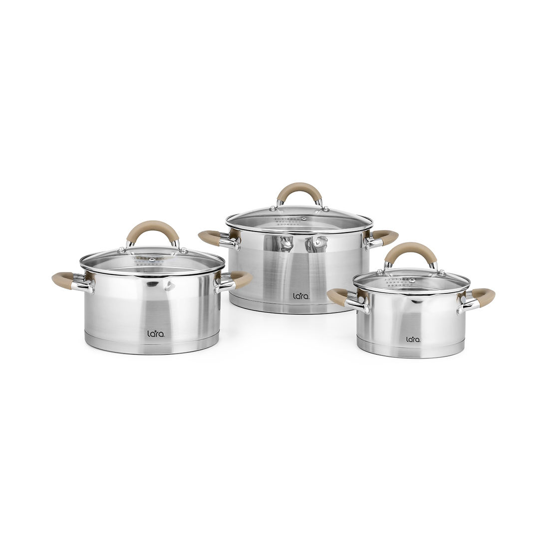 Набор посуды, LARA, БЕРЛИН LR02-119, 6 пр, Кастрюли 3шт, Крышки 3 шт, Диаметр 16/20/24 см, Объем 1.7л/3.1л/5.7л, Нержавеющая сталь, Сливной носик, Для всех типов плит, Мойка ручная/в посудомоечной машине, Стальной