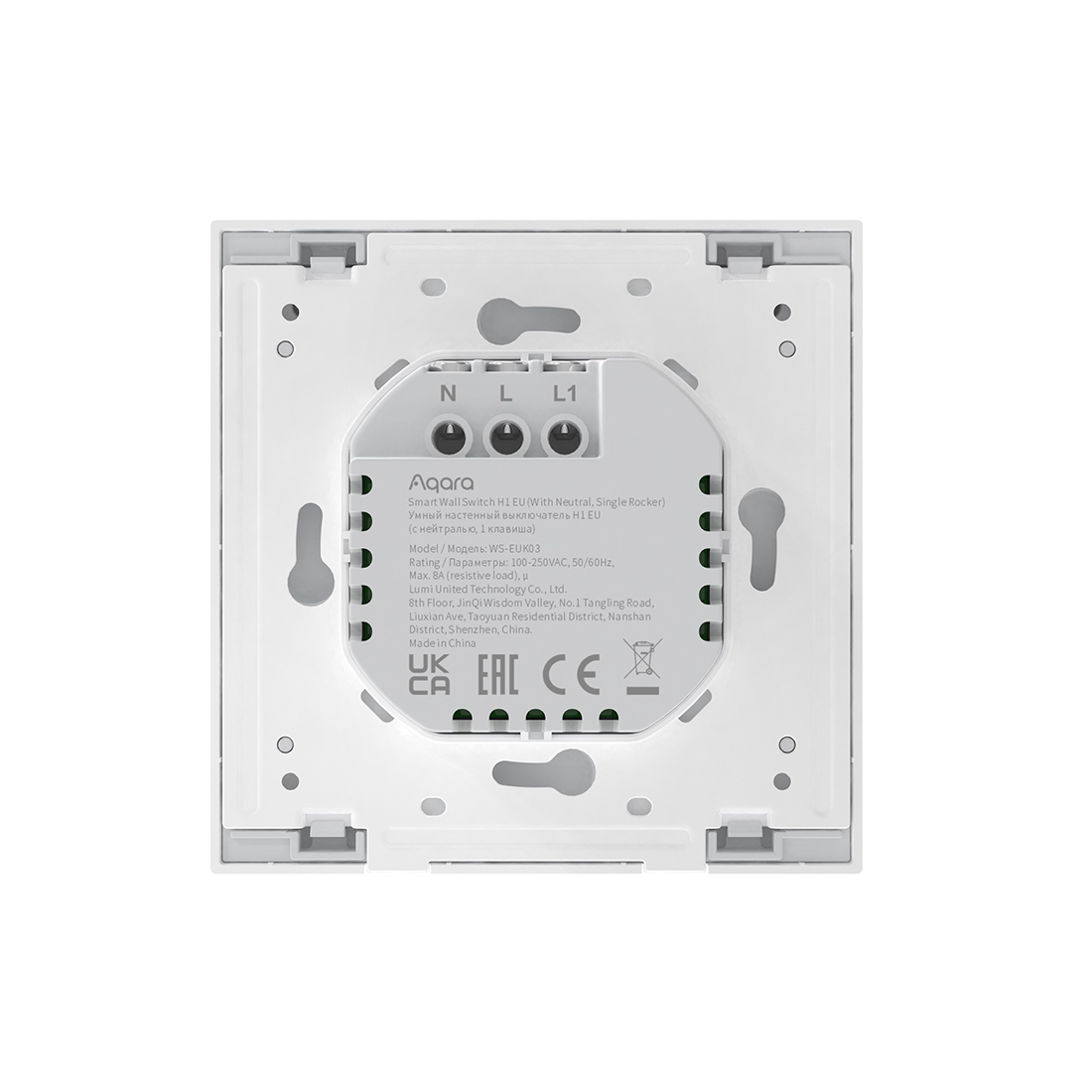 Настенный выключатель одноклавишный, Aqara, Smart Wall Switch H1 (With Neutral, Single Rocker), WS-EUK03, 86 х 86 х 37,55 мм, Zigbee 3.0, Напряжение питания: 100 – 250 В~, 50/60 Гц, Максимальная нагрузка: 2000 Вт, 0°С…+40°С, Для работы устройства требуется Центр умного дома (Hub) с поддержкой Zigbee 3.0, Работает с Алисой, Белый