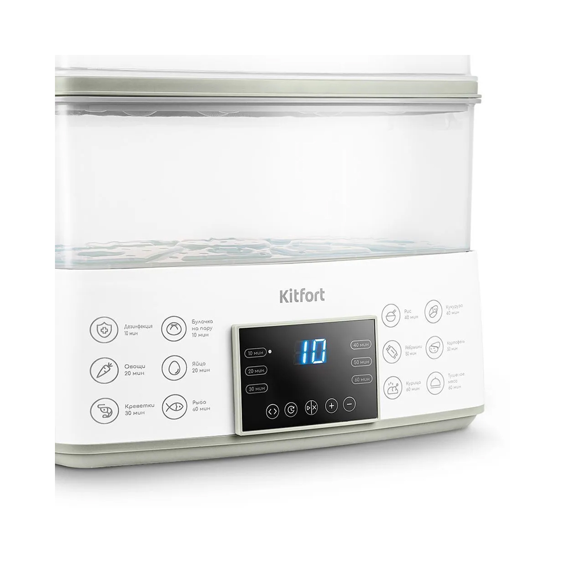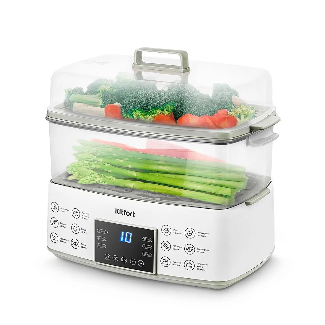 Пароварка, Kitfort, КТ-6431, 2 яруса, Объем корзин 6.2л, Объем резервуара для воды 1.7л, Время приготовления 60 мин, Отложенный старт 24ч, Электронное управление, Мощность 800 Вт, Длина шнура 0.8м, Белый