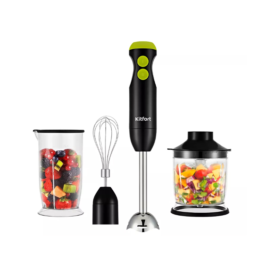 Погружной блендер, Kitfort, КТ-3041-2, Мощность 350 Вт, 2 скорости, 3 насадки, Мерный стакан 700 мл, Черный-Салатовый