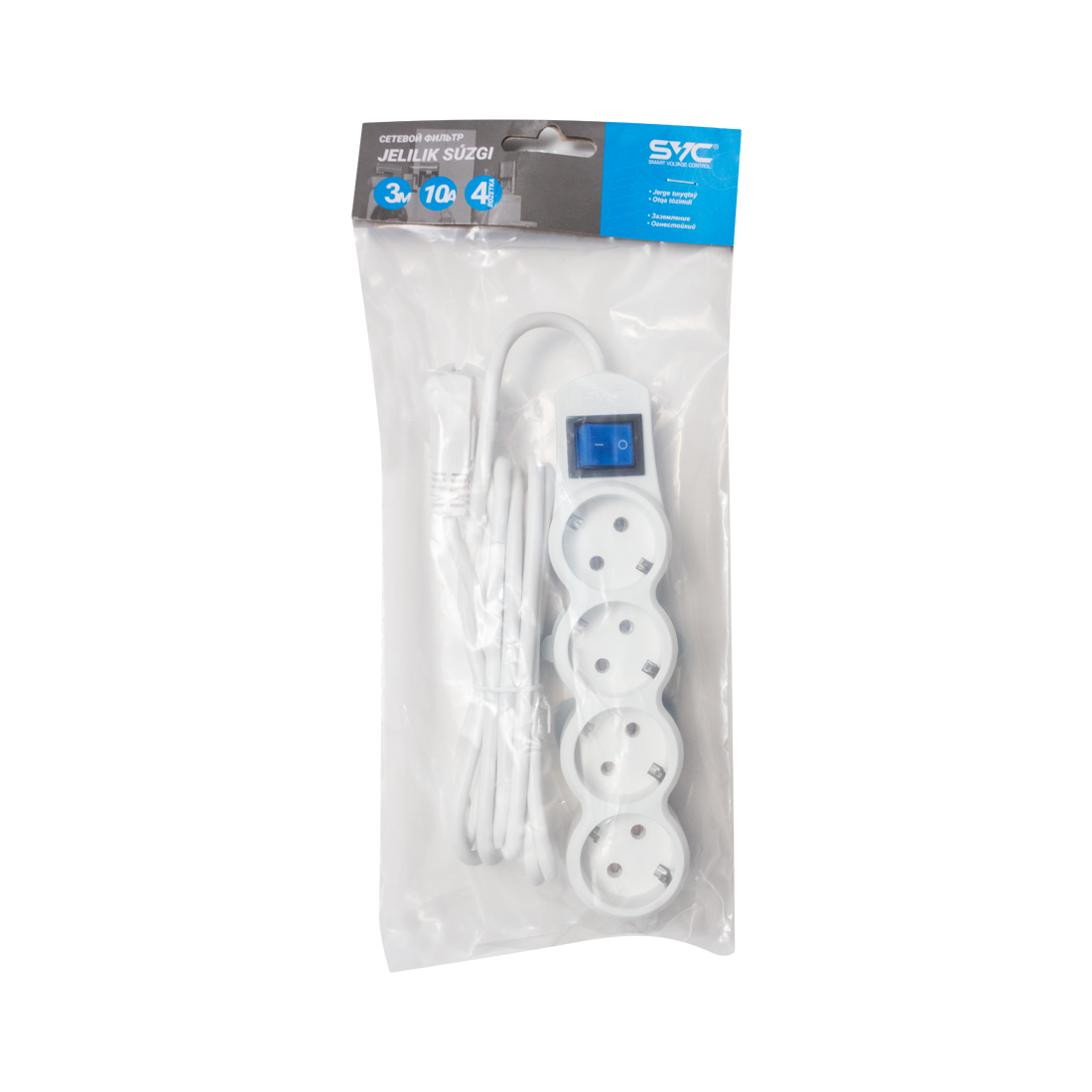 Сетевой фильтр, SVC, ZP4S-30M, 4 розетки, 3 метра, 220-250В, 10A, полиэтиленовая упаковка, белый
