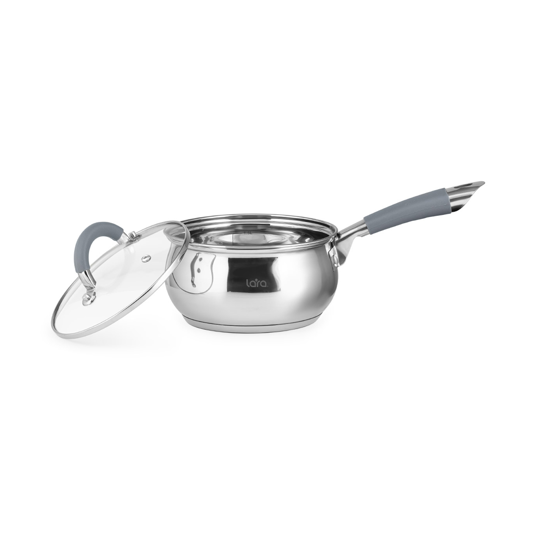 Сотейник, LARA, BELL LR03-14, Круглая, Диаметр 16 см, Высота 9.5 см, Объем 1.8л, Нержавеющая сталь/ Стекло, Для всех типов плит, Мойка ручная/в посудомоечной машине, Стальной