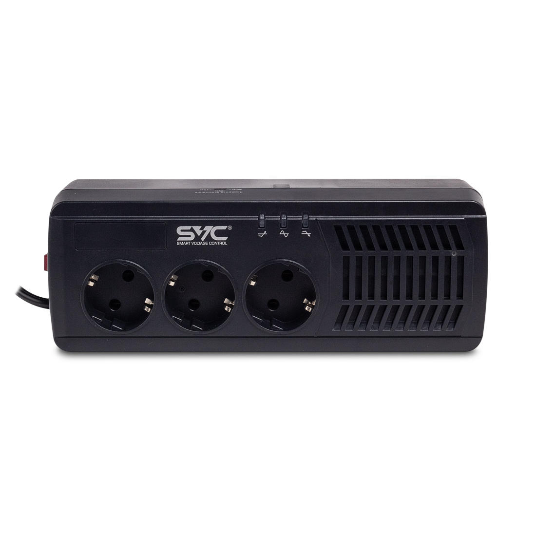 Стабилизатор (AVR), SVC, AVR-1005-U, Мощность 600ВА/300Вт, Диапазон работы AVR: 176-273В, Тип выходных разъёмов: Schuko х 3 шт., LED-индикаторы, Чёрный