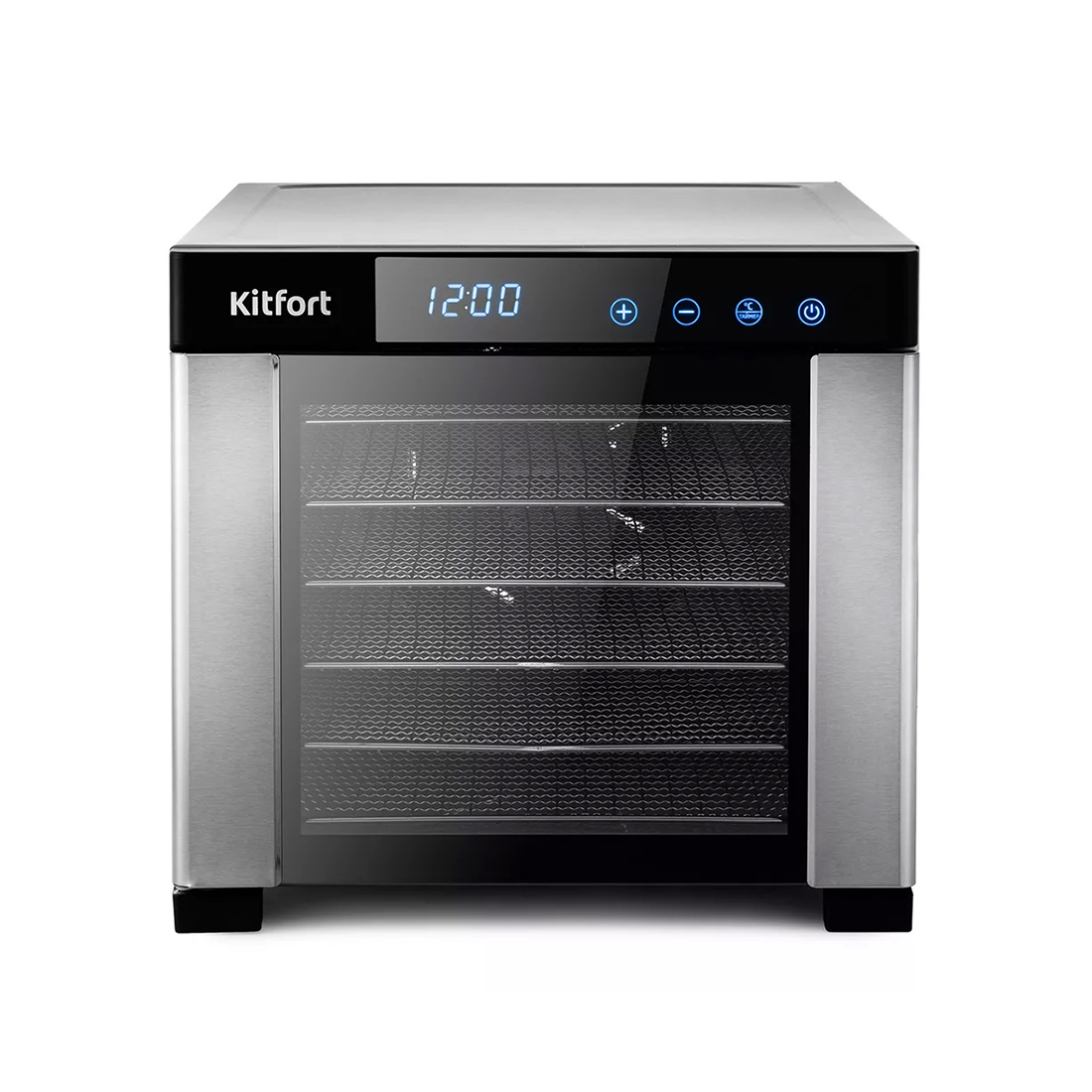 Сушилка для овощей и фруктов, Kitfort, КТ-1911, Мощность 650 Вт, Горизонтальный обдув, Максимальная температура 75 °C, Минимальная температура 35 °C, Длина шнура 0.9м, Дисплей , Таймер, Защита от перегрева, 12 поддонов, 6 сеток, Серебристый