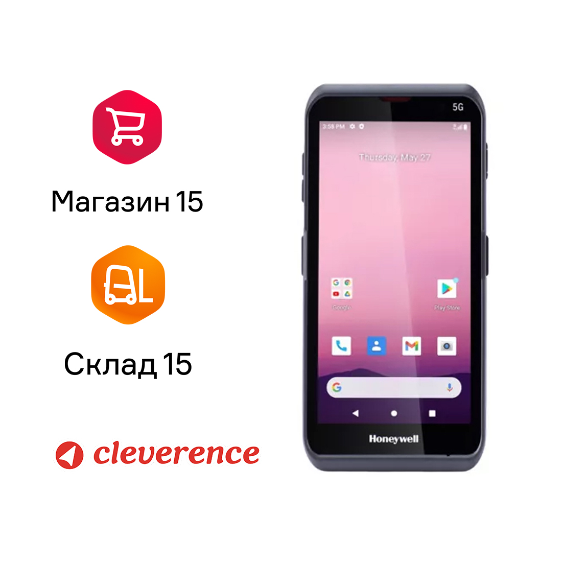 Терминал сбора данных, Honeywell, EDA57-11BE61H21RK, 5.5″, сенсорный, без отпечатков и eSIM, WLAN(Wifi 6) + WWAN (5G), фронтальная и тыловая камера, 4 ГБ ОЗУ, 64 ГБ ПЗУ, увеличенная батарея, чёрный + ПО Cleverence