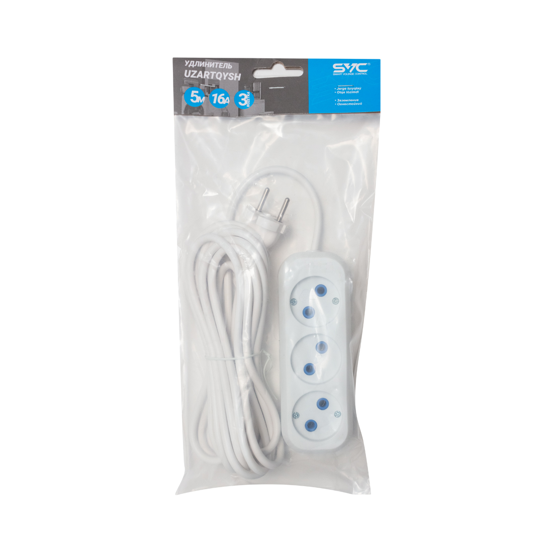 Удлинитель, SVC, XP3S-50M, 3 розетки, 5 метров, 220-240В, 16A, Полиэтиленовая упаковка, Белый