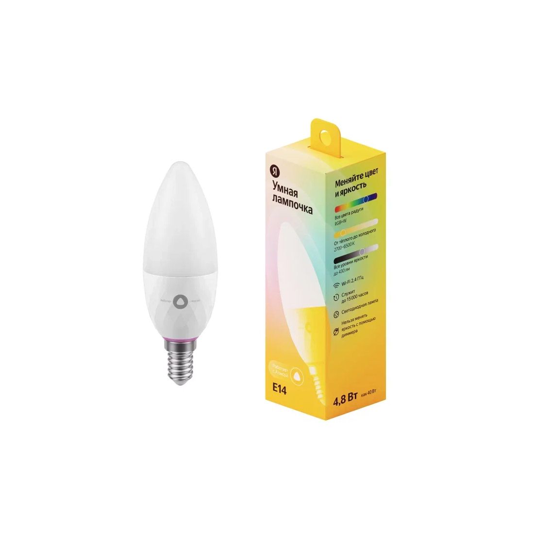 Умная лампочка, Яндекс, YNDX-00017, E14, 4,8 Вт, 430 лм, 2700-6500К, RGB+W, Wi-Fi(2,4 ГГц), Экосистема Яндекс, белый