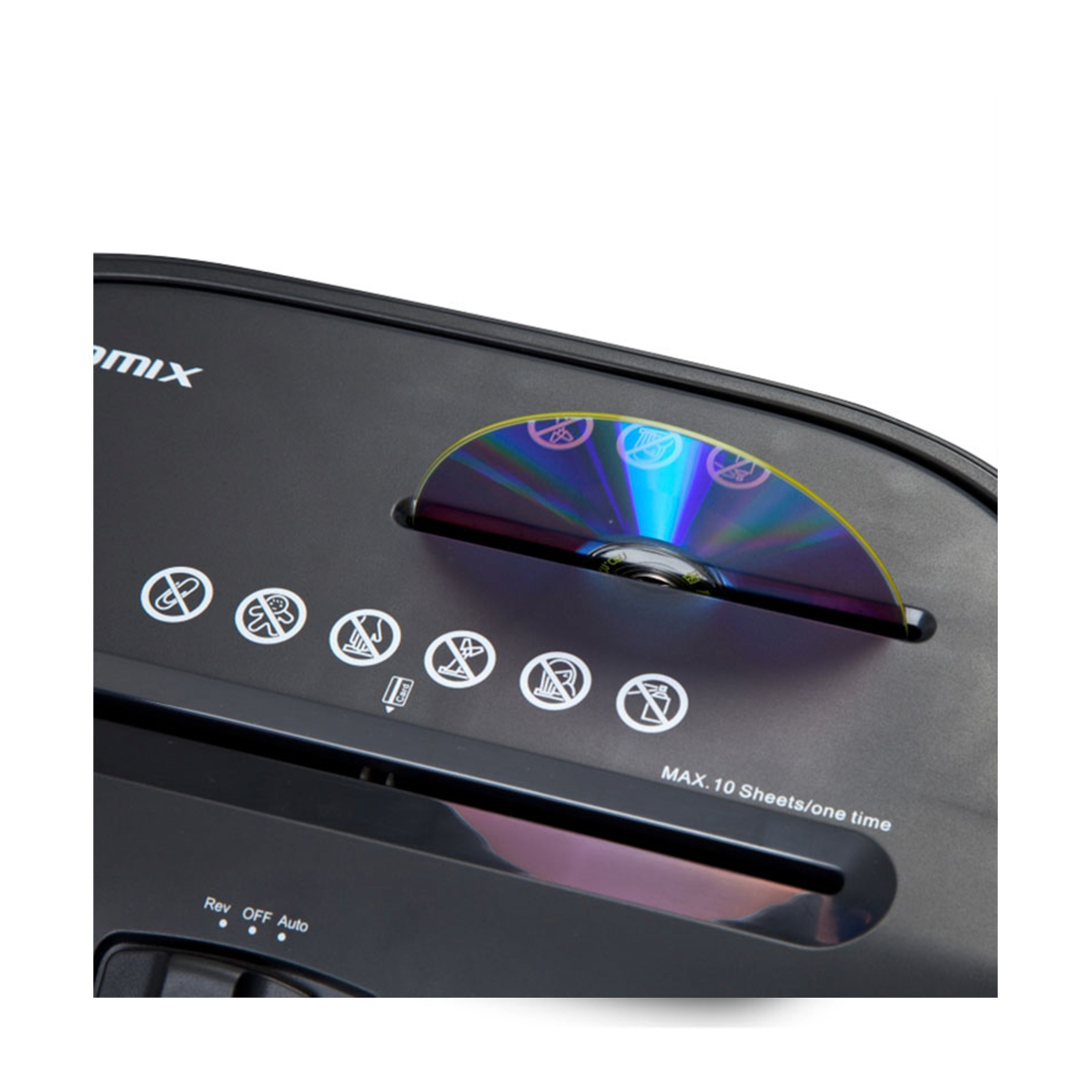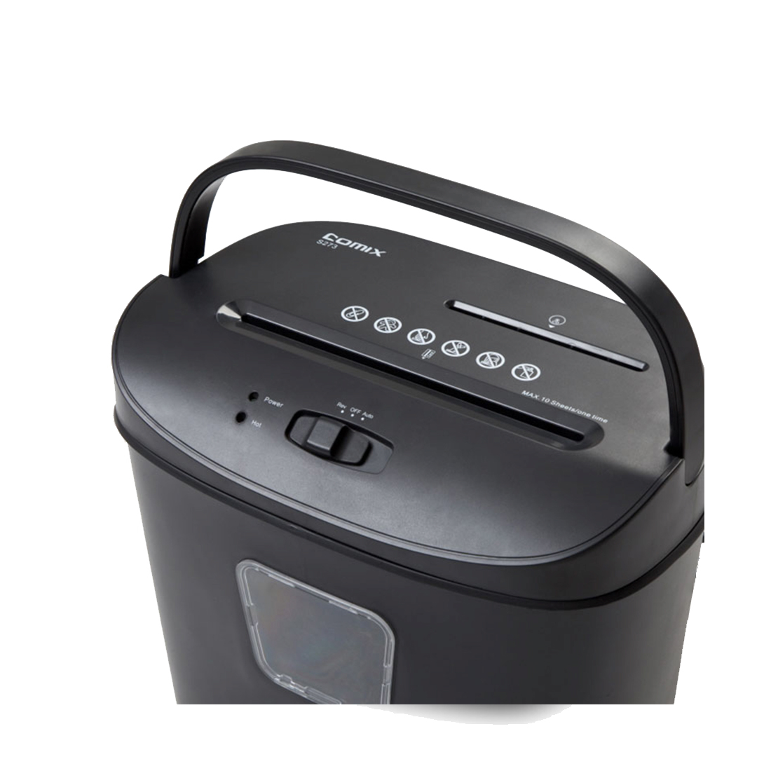 Уничтожитель бумаг, COMIX, S273, A4, Подача: 10 лист., Уничтожение CD/кредитных карт, Уровень секретности — 3, Скорость — 2,5 м/мин (34 мм/сек), Ёмкость корзины 17 л., 72db, Перекрёстная резка, Чёрный
